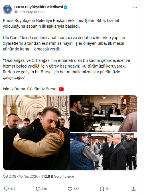 Bursa Büyükşehir Belediye Başkan Vekili Şahin Biba, görevine sabahın erken saatlerinde başladı. Ulu Cami'de kılınan sabah namazının ardından vatandaşlarla bir araya gelen Biba, günün ilk programında esnaf ve yurttaşlarla buluştu.